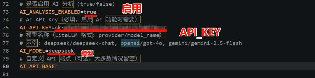 # 是否启用 AI 分析 (true/false)AI_ANALYSIS_ENABLED=true# AI API Key(必填,启用 AI 功能时需要)AI_API_KEY=sk-xxxxxxx# 模型名称(LiteLLM 格式: provider/model_name)# 示例: deepseek/deepseek-chat, openai/gpt-4o, gemini/gemini-2.5-flashAI_MODEL=deepseek# 自定义 API 端点(可选,大多数情况留空)AI_API_BASE=