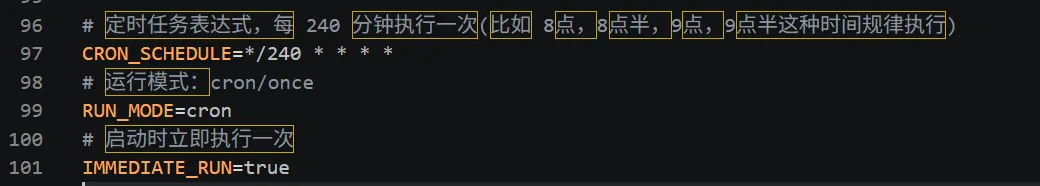 # 定时任务表达式,每 240 分钟执行一次# (比如 8点,8点半,9点,9点半这种时间规律执行)CRON_SCHEDULE=*/240 * * * *# 运行模式:cron/onceRUN_MODE=cron# 启动时立即执行一次IMMEDIATE_RUN=true