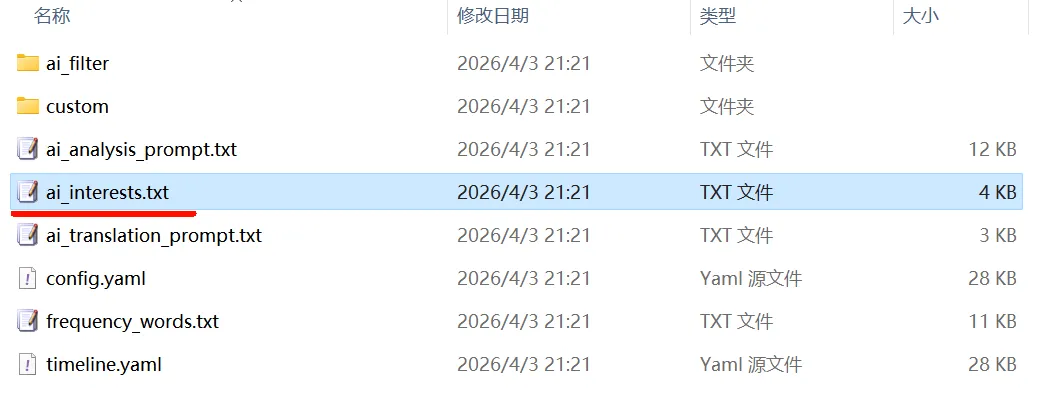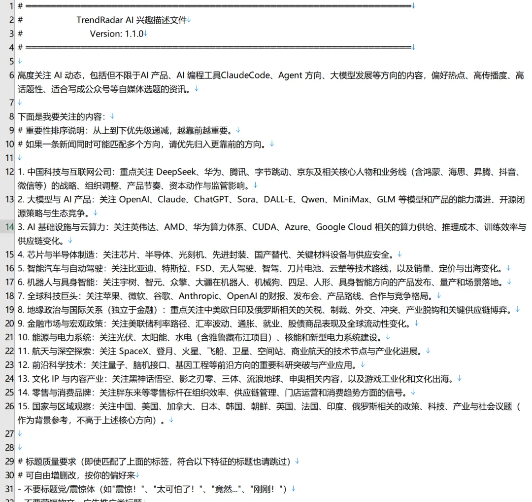 打开 config/ai_interests.txt,这个文件很有意思,里面用自然语言描述你关注的方向就可以了。