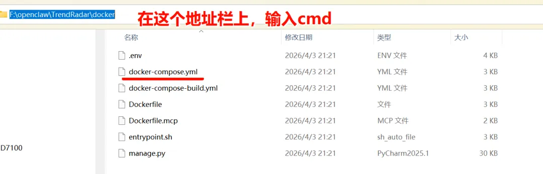 配置全部完成后,进入项目里的 docker 目录,在地址栏输入 cmd 打开命令提示符,