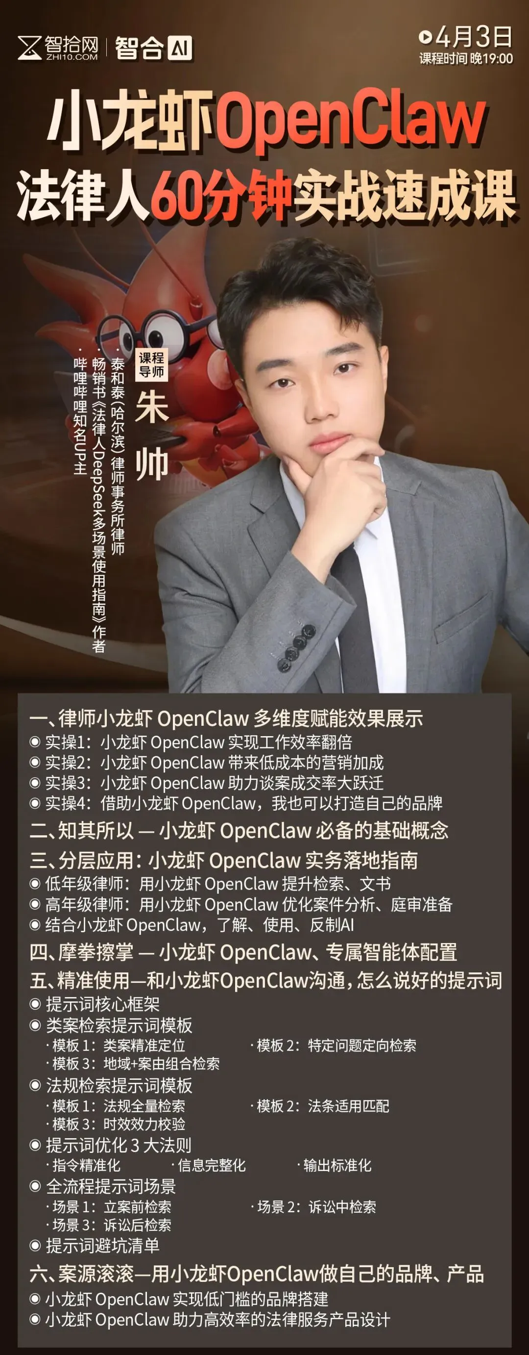 本期课程,泰和泰(哈尔滨)律师事务所朱帅律师,为大家打造小龙虾OpenClaw:法律人60分钟实战速成课。无论你是刚安装OpenClaw、无从下手的新手律师,还是已经尝试使用、却始终无法落地实务的资深律师,这60分钟都能帮你直接打破困境——实操演示+落地指南+提示词框架+法律服务产品设计,一站式通关。