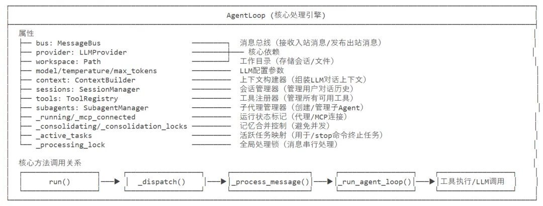 核心作用:_process_message 支持系统消息、斜杠命令、普通对话三种场景,完成「上下文构建→代理循环→结果保存→响应返回」全流程。