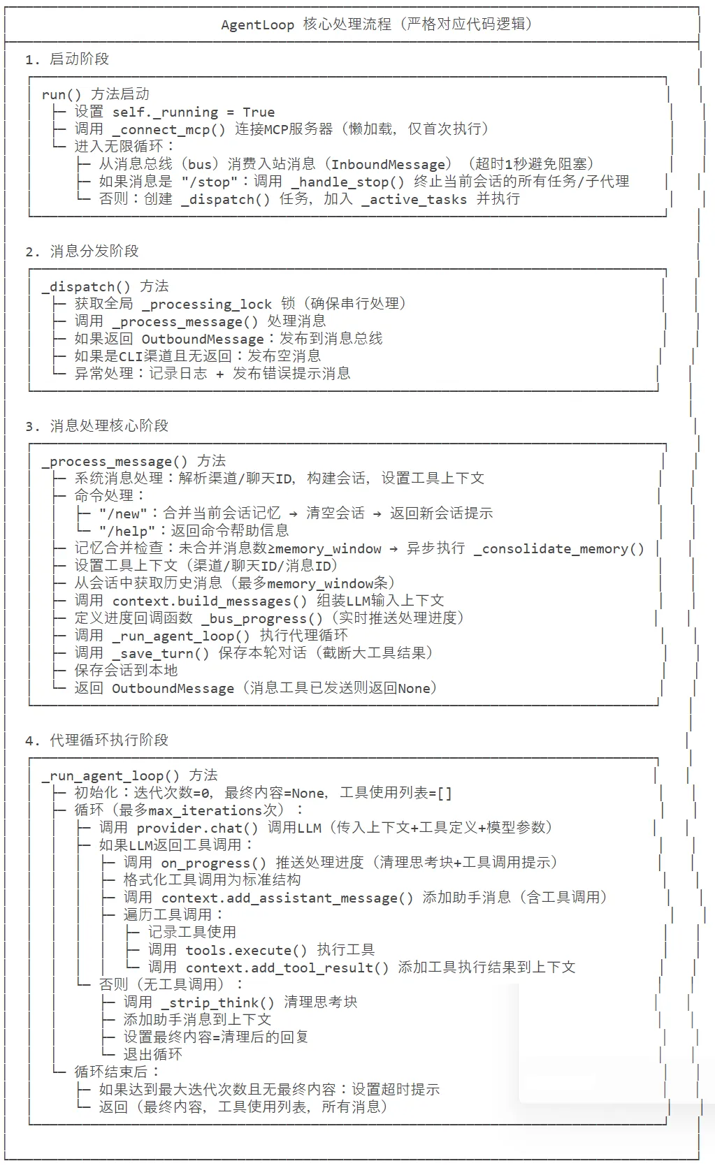 入口:消息到达(InboundMessage)↓AgentLoop.run() - 监听并接收消息↓AgentLoop._dispatch() - 分派处理↓AgentLoop._process_message() - 主要处理逻辑↓ContextBuilder.build_messages() - 构建上下文↓AgentLoop._run_agent_loop() - 核心代理循环↓Provider.chat() - LLM交互↓← 判断是否有工具调用↓ 否← 返回最终内容↓ 是← 执行工具调用↓ContextBuilder.add_tool_result() - 添加工具结果↓← 继续循环直到没有更多工具调用↓AgentLoop._save_turn() - 保存交互记录↓通过MessageBus发布OutboundMessage - 发送响应