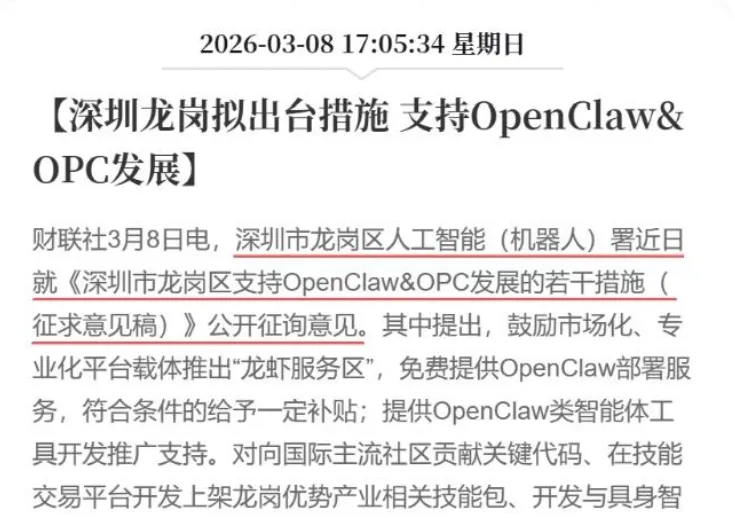 全国独有政策:龙岗是国内首个专门针对OpenClaw 和 OPC 出台扶持政策的区域,红利领先。