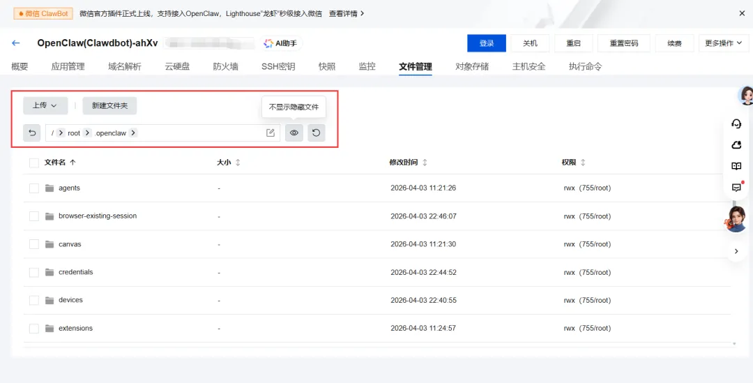 如果你用的是腾讯云轻量服务器,打开应用管理的文件管理器,进到用户目录(一般是/home/admin/或者/root/),找到.openclaw文件夹就行。