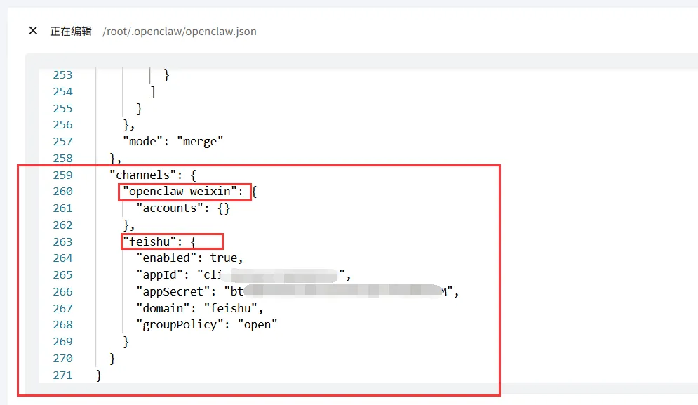 每个通道都有自己的子配置。比如Discord通道下面还会有dmPolicy(谁能私聊龙虾)、群组的mention配置(是否需要@才回复),对于飞书,有appid和appsecret。