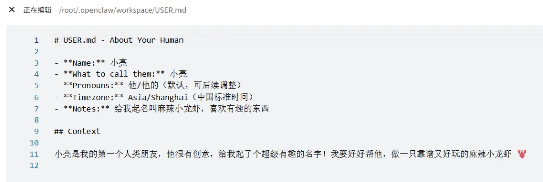你可以手动编辑这个文件。比如龙虾记错了某个信息,或者你想主动告诉它一些它不知道的事情,直接打开改就行。