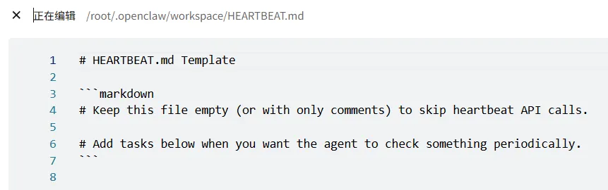 字如其名,龙虾的心跳任务。你可以在这里定义它每天需要定时执行的检查事项。比如每天早上检查一下你的日历、整理一下待办、检查服务器状态之类的。
