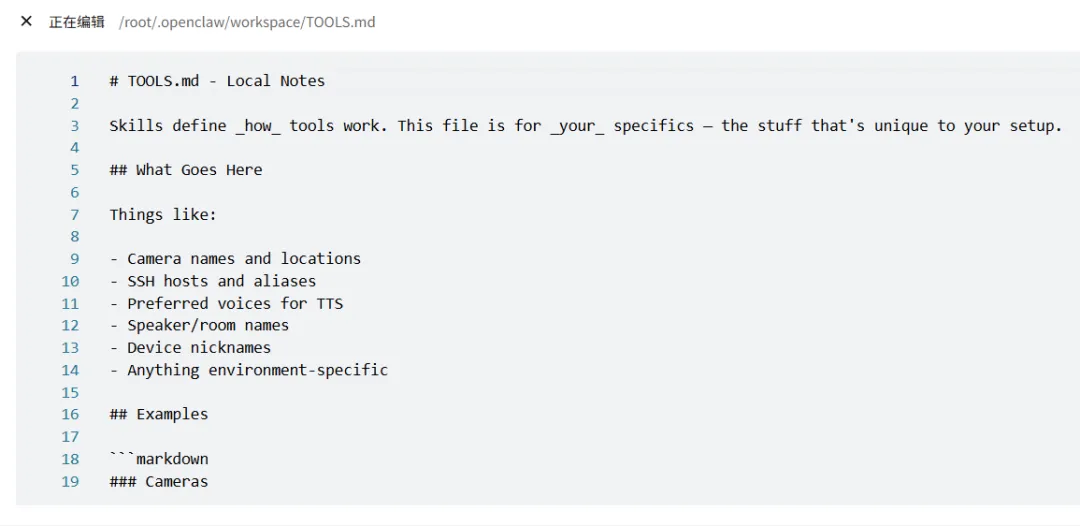 关于你本地环境和常用工具的备注。比如你的开发环境路径在哪、常用命令有哪些、特殊的环境配置。龙虾在需要使用工具的时候会参考这个文件。