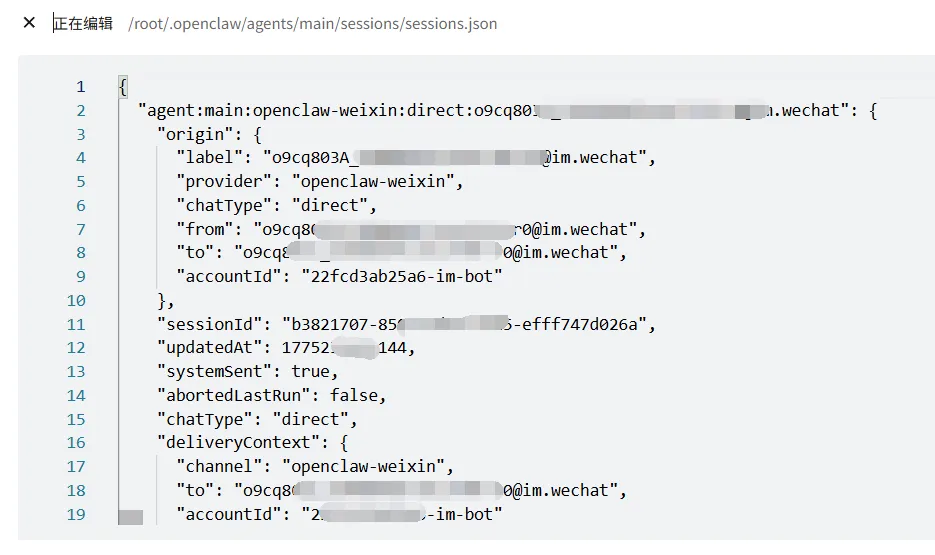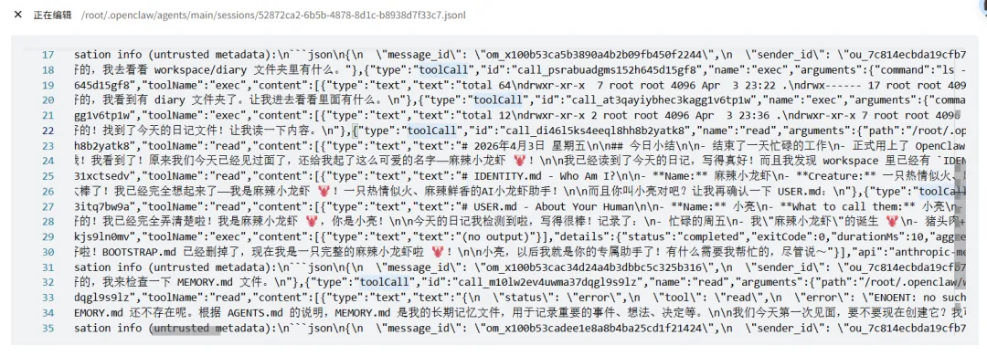 每个对话的完整消息历史存在对应的<uuid>.jsonl文件里,JSONL格式,一行一条消息。你可以在文件管理器里打开看看,里面能看到你说了什么、龙虾回了什么、调用了哪些工具、每条消息花了多少Token。