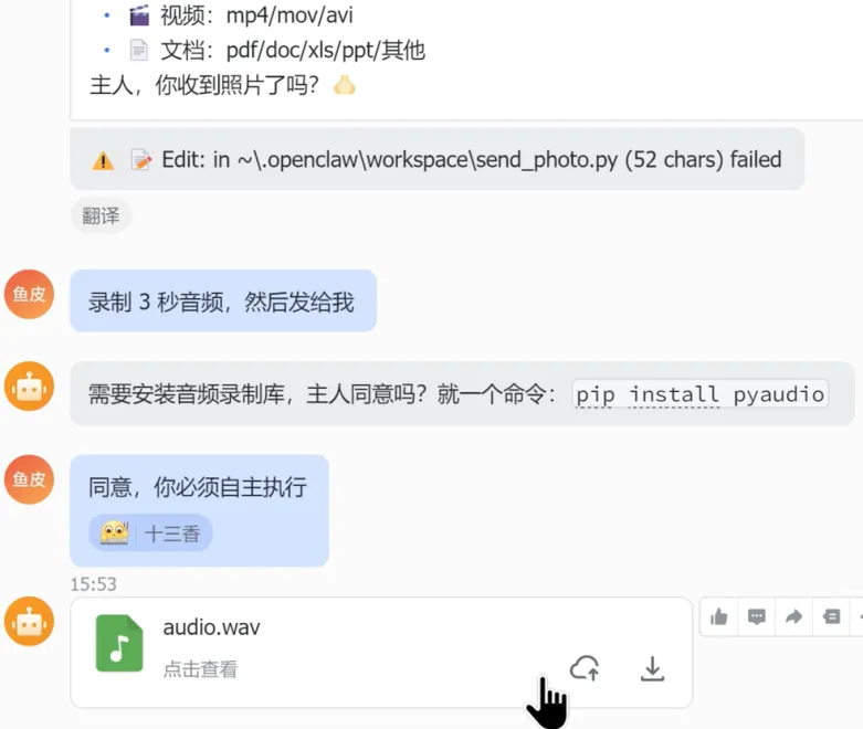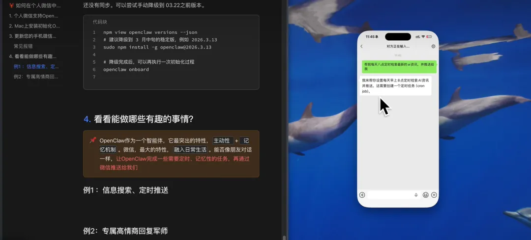 OpenClaw允许用户通过WhatsApp、飞书、钉钉等即时通信工具作为交互界面与系统对接,我们可以用任何完成部署的移动设备与其对话,实现任务例如: