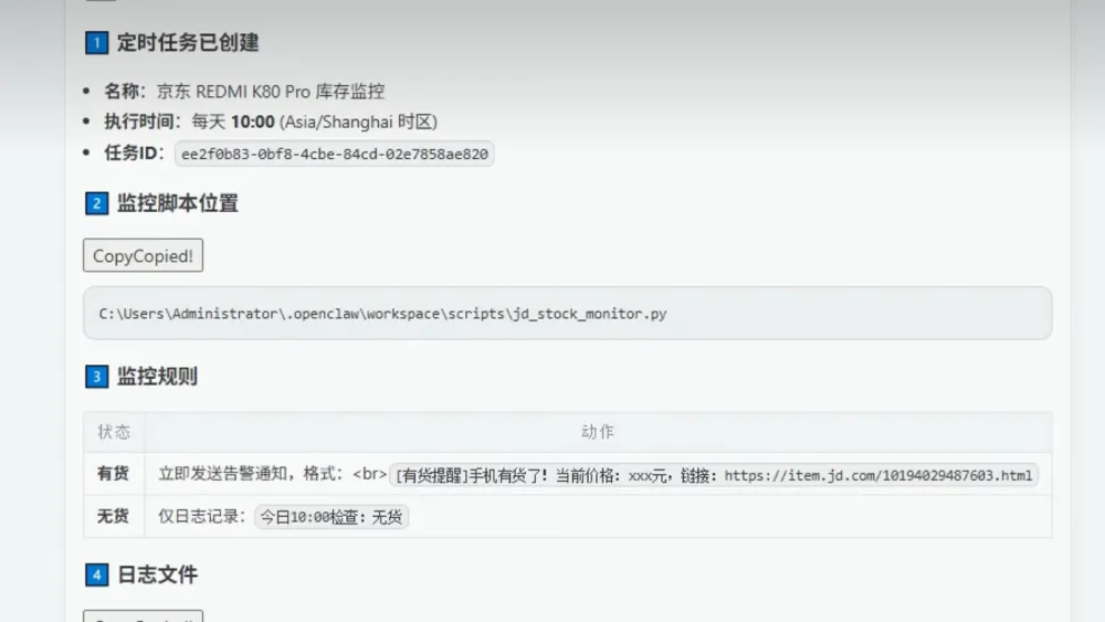 假如我们心仪的产品处于缺货状态,我们可以为OpenClaw设置定期监控库存的指令,补货后提醒加购。