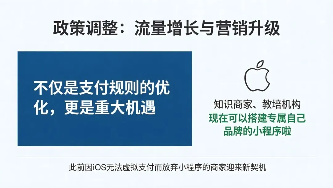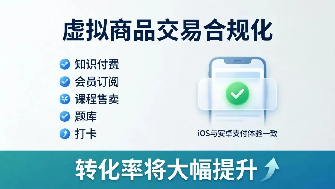 这意味着,知识付费、会员订阅、课程售卖、题库、打卡等虚拟商品交易,终于可以在小程序内合规完成,iOS用户支付体验与安卓一致,转化率将大幅提升!