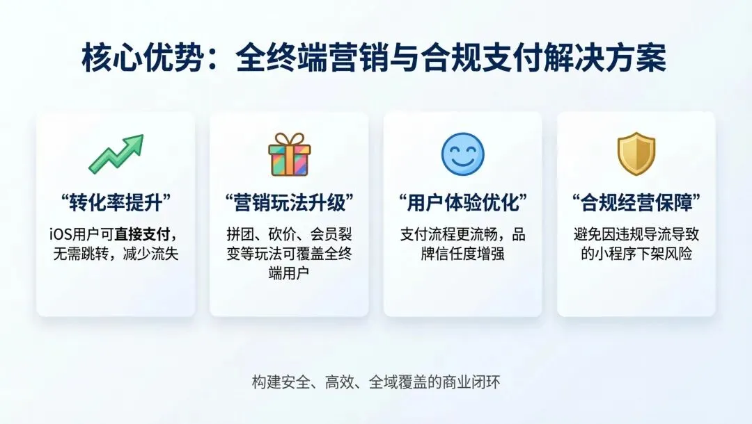 长期以来,微信小程序的虚拟支付功能在iOS端受到严格限制,商家不得不引导用户跳转H5、公众号或外部链接完成支付,导致用户体验割裂、转化率下降、营销玩法受限。