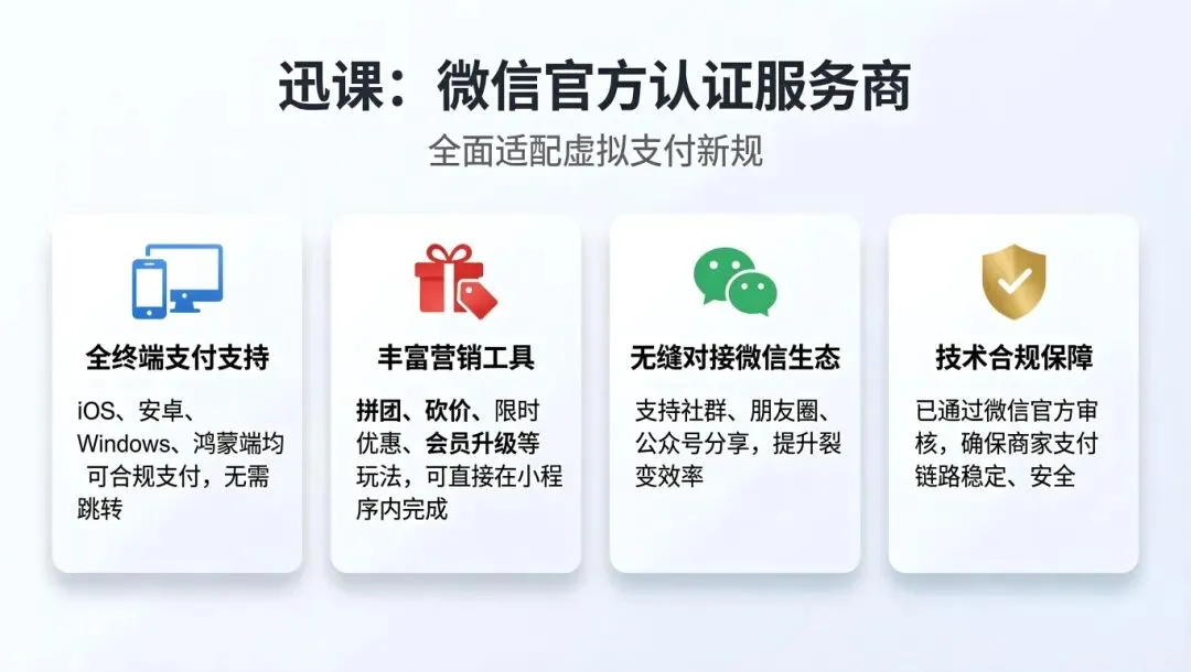 迅课作为微信官方认证服务商,已全面适配虚拟支付新规,并提供以下核心能力: