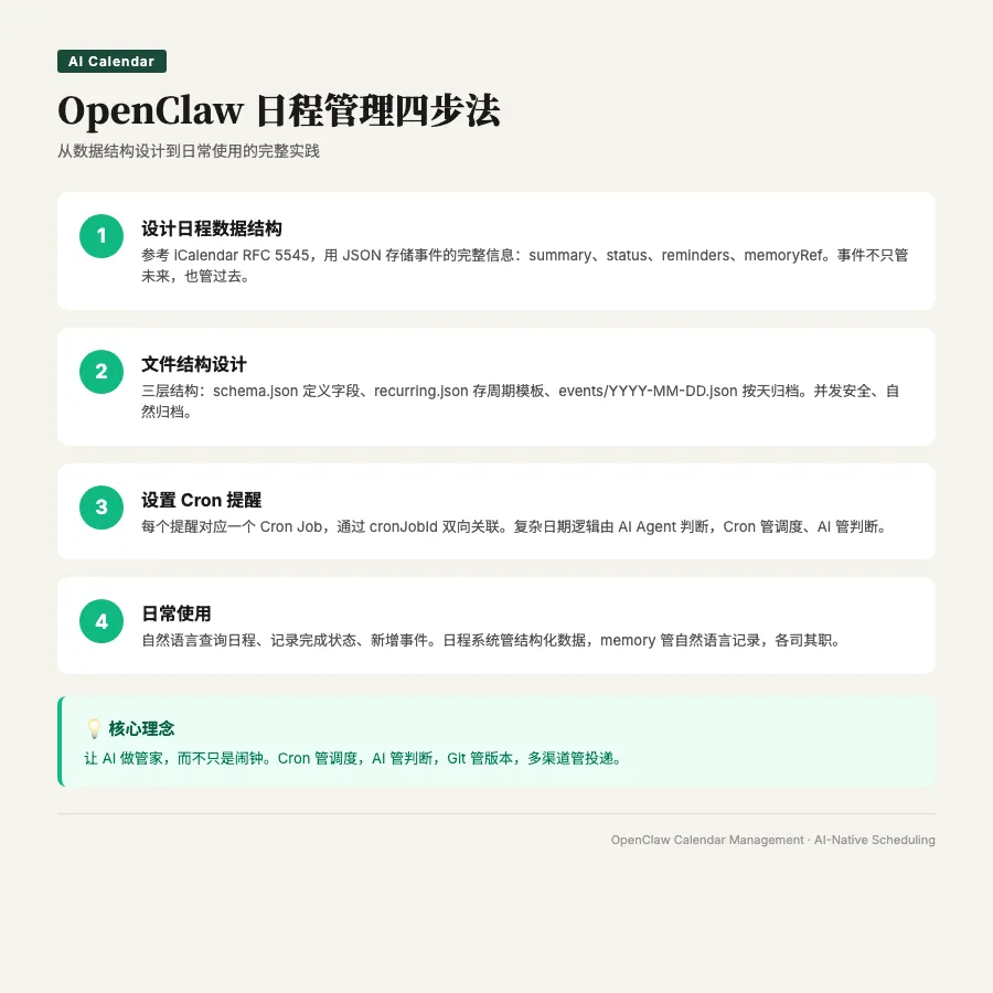 OpenClaw 的日程管理不是要替代 Google Calendar,而是提供了一种AI 原生的管理方式: