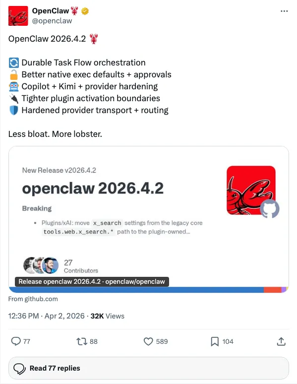 这次 OpenClaw 2026.4.2 表面上看只是一次常规发版,但结合官方 X 帖子和 GitHub release 去看,重点并不在“又多了什么新功能”。