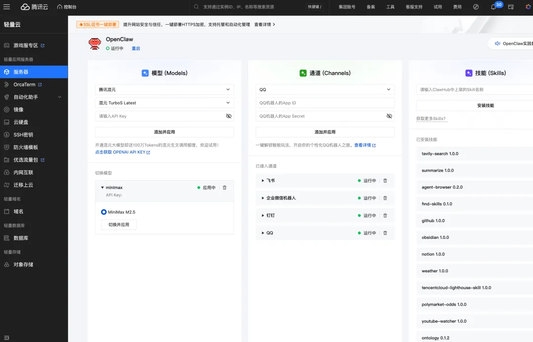 管理实例-应用管理,使用云端小龙虾,模型切换,和通道配置(目前配置了飞书、Telegram,WhatsApp、企业微信、钉钉、QQ等),简直不要太丝滑。 目前,最常用的还是Telegram、飞书。 安装的Skill,也有很清晰的可视化面板,大爱。