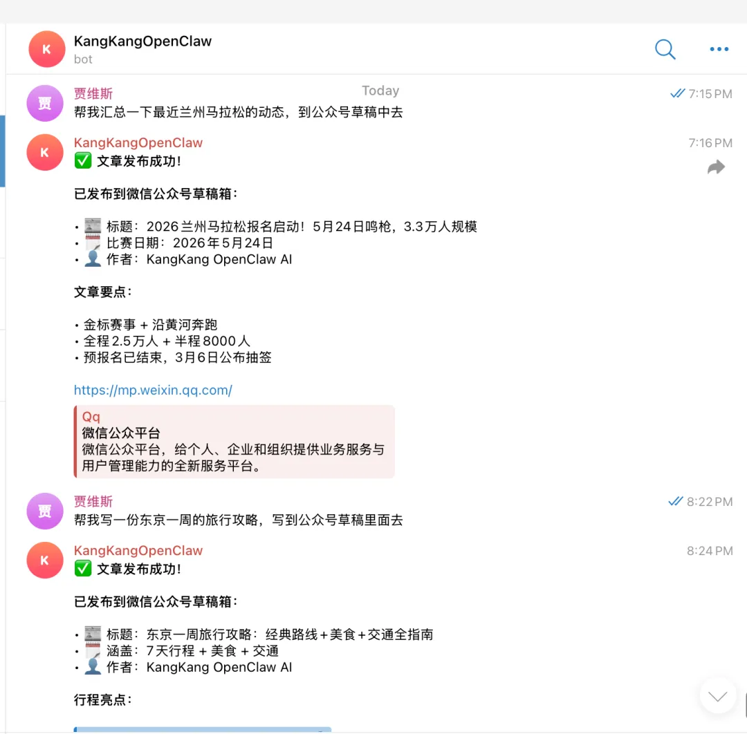 使用下来的感受,还是很魔幻的,随时随地有什么写作的灵感/素材,告诉Telegram后,这篇草稿,就已经自动的放在公众号草稿了。