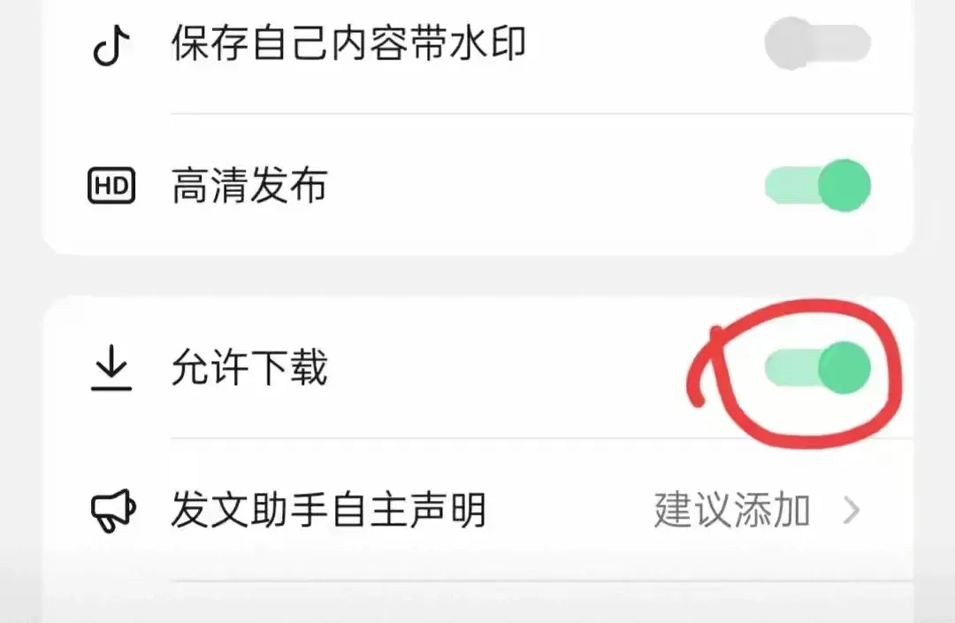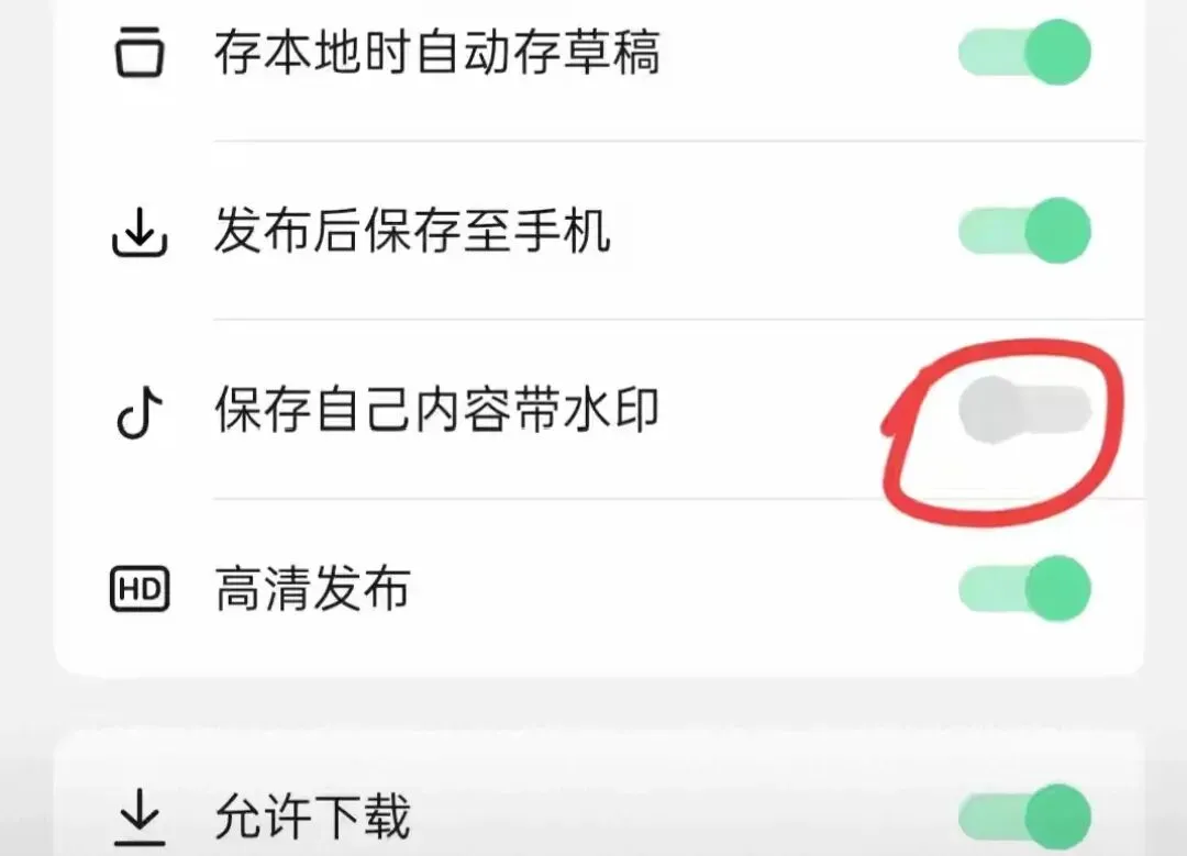 另外,“保存自己内容带水印”的选项,建议大家不要关闭,否则自己下载时也会有水印。关闭“允许下载”功能后,他人就无法盗用我们的视频了(如上图所示)。