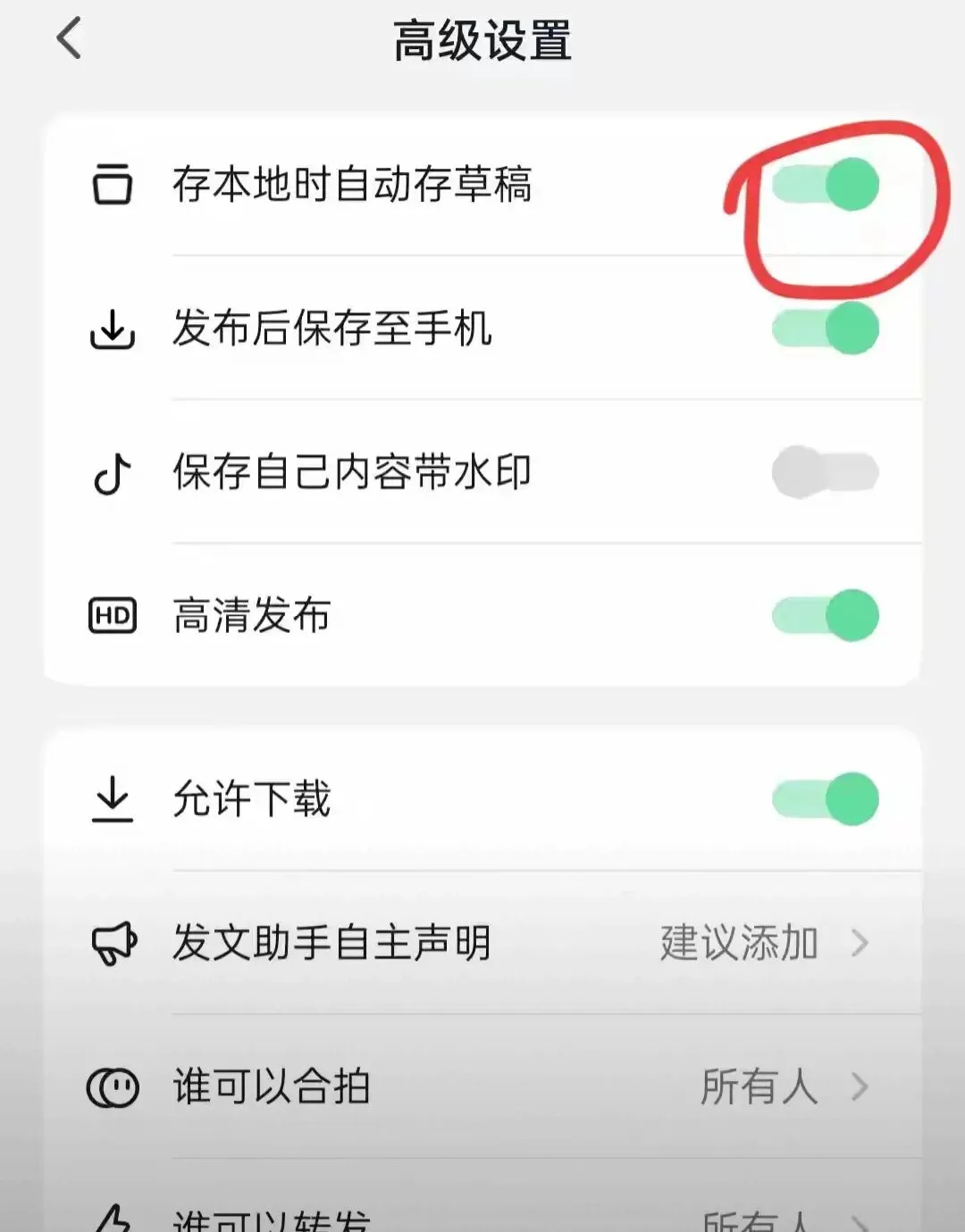 除此之外,你还应关闭“存本地时自动存草稿”的选项,以免发出的视频自动保存到手机相册,占用宝贵的手机内存(如上图所示)。