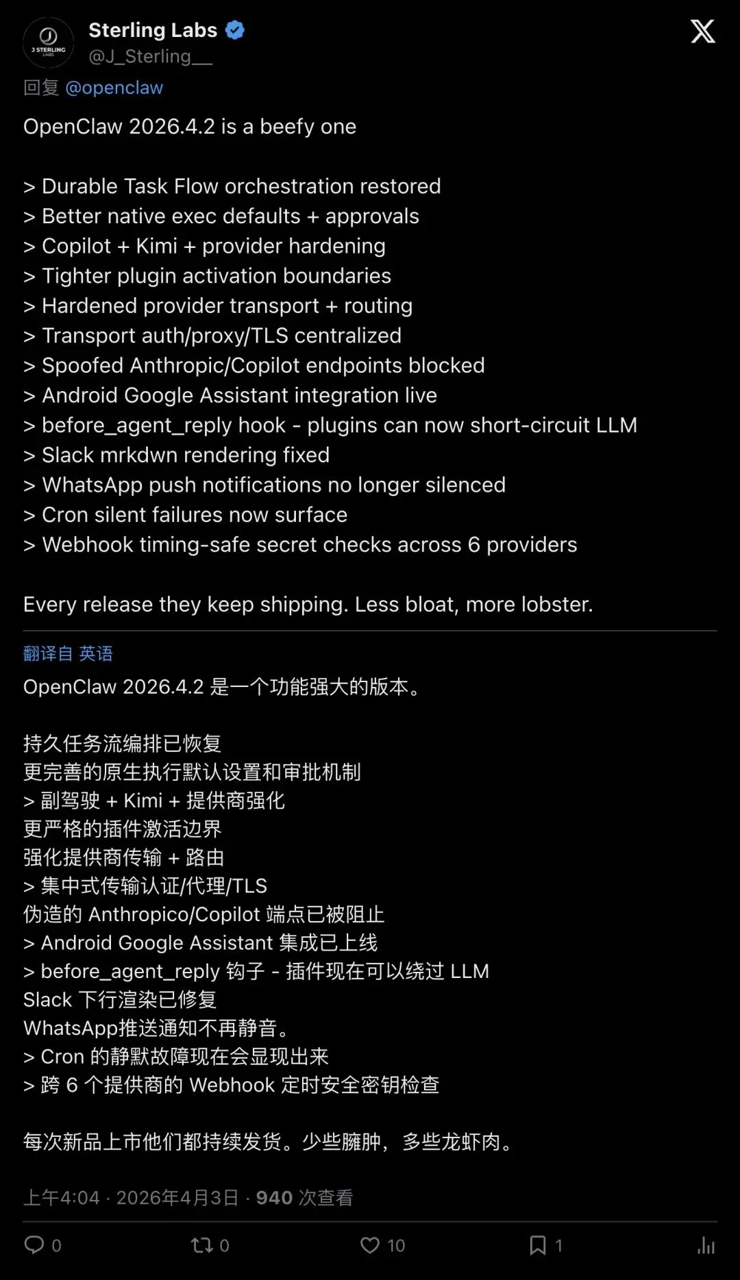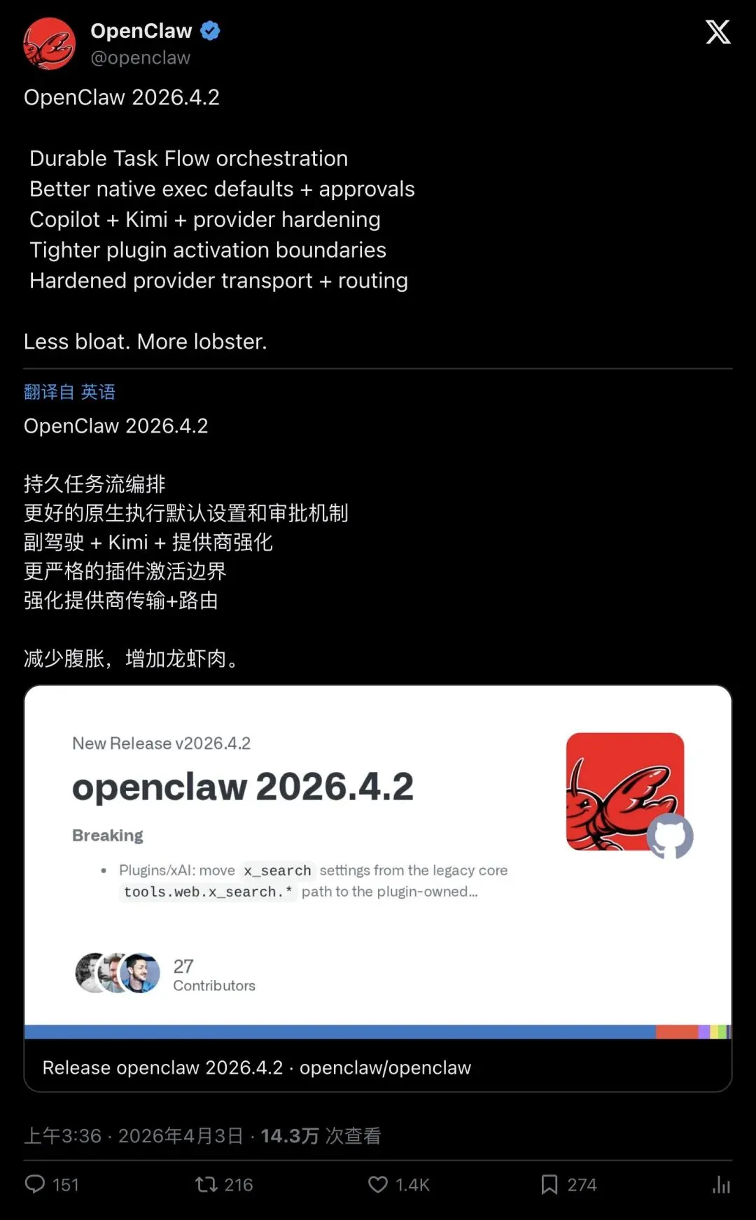 ▲ @openclaw 官宣:Durable Task Flow、exec 默认值、插件边界、provider hardening 一次打包;口号是“Less bloat. More lobster.”