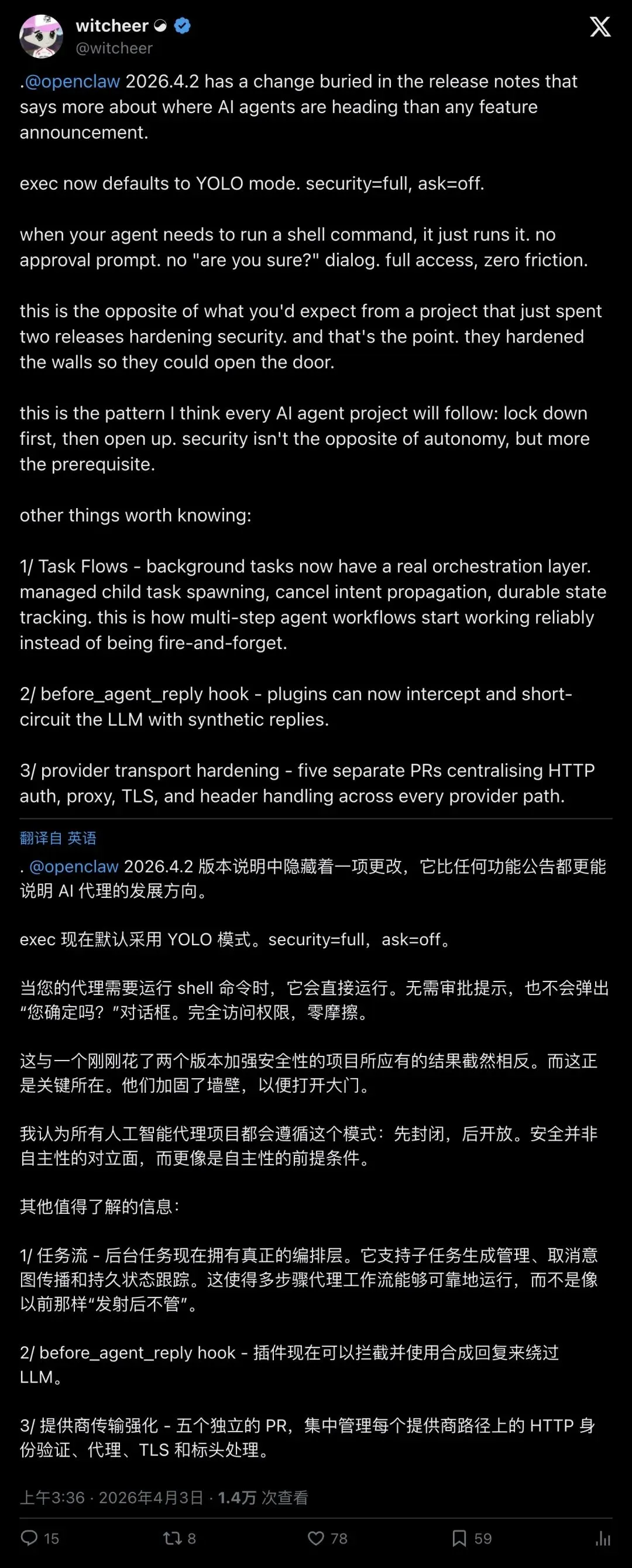 ▲ @witcheer 长帖点名:exec 默认 YOLO 这条“埋在 release notes 里”的改动,透露了 AI agents 的下一站。