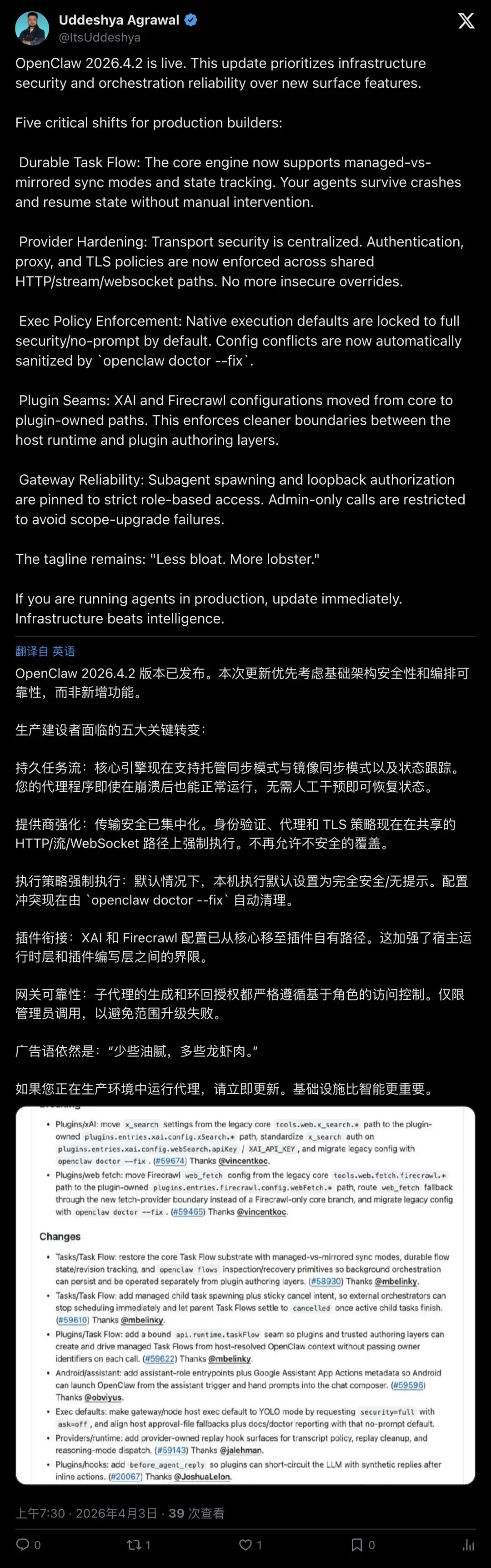 ▲ @ItsUddeshya:把 2026.4.2 总结为生产构建者的“五个关键转变”,其中 exec policy/no-prompt 与 provider hardening 被放在同一层叙事里。