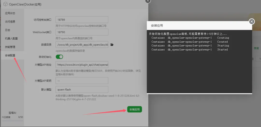 1、打开 OpenClaw(Docker应用) 的配置按钮 2、配置大模型api地址、模型秘钥和默认模型(如不会填可无视本条)。 3、在当前的 安装配置 页面,点击 安装应用步骤 3:配置机器人(5 分钟)