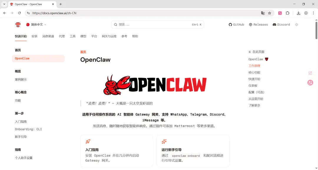 官方入门指南:https://docs.openclaw.ai/zh-CN