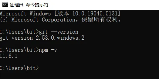 环境都安装完成后需要验证下npm和git是否都正常安装了,需要打开dos窗口,输入git --version和npm -v命令检查环境是否安装成功: