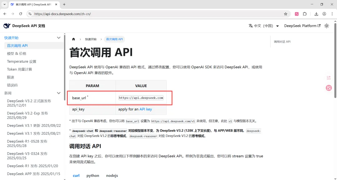 在API接口文档中,可以看到DeepSeek API的调用地址为https://api.deepseek.com: