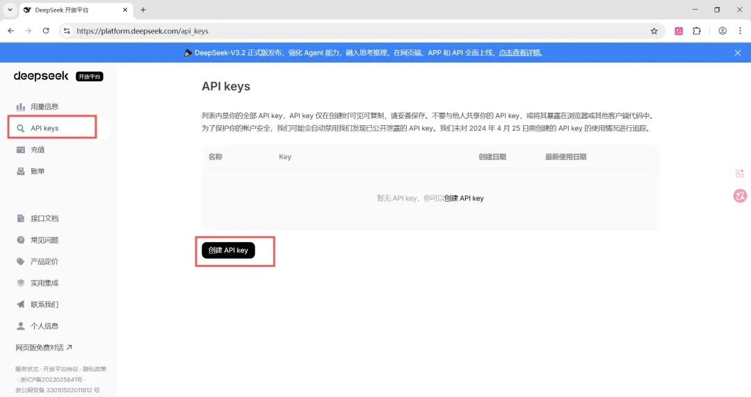 接下来需要获取API KEY,需要注册登录DeepSeek API开放平台,进入后点击API keys进入对应页面: