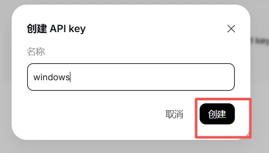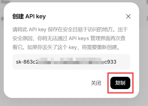 创建后会弹出对应的API key,选择复制,然后粘贴到文档中保存(这里key值只出现一次,要记得保存,如果没存需要重新创建一个API key):