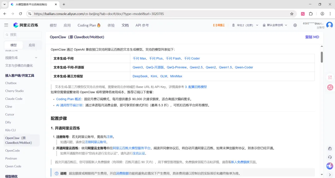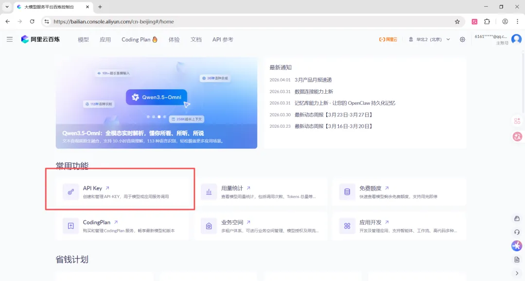 使用千问API需要注册阿里云账号,同时开通百炼服务: