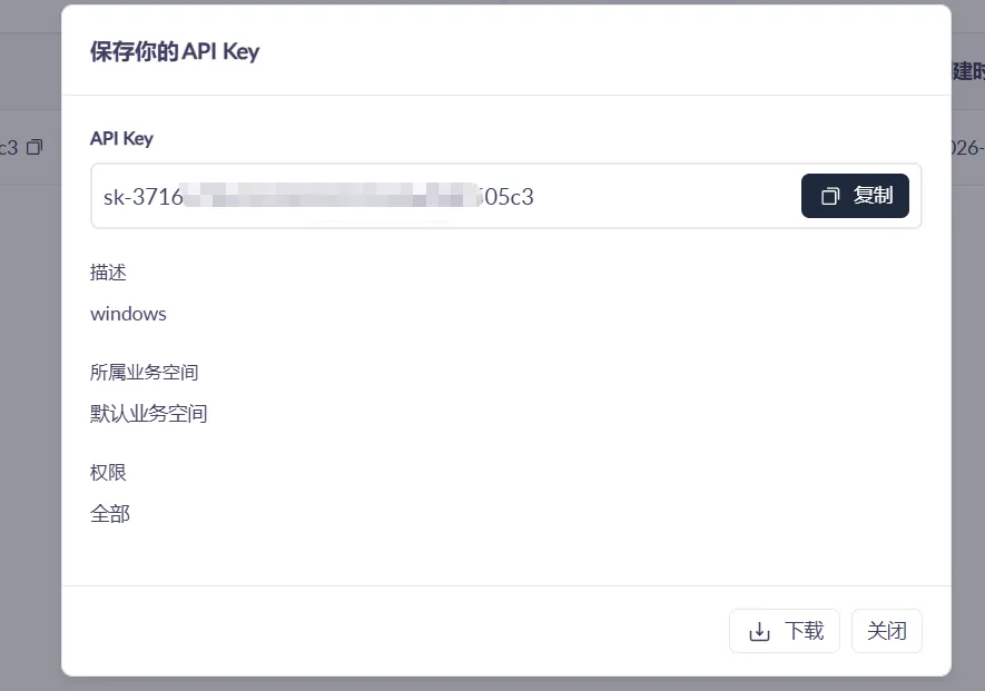 点击确定后会弹出生成的API Key,我们下载保存下来: