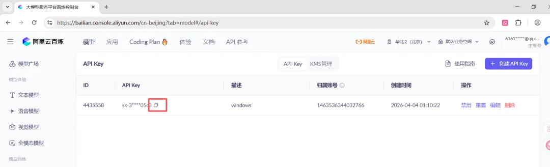 注册完账号后,我们直接进入阿里云百炼控制台,点击API Key进入管理页面: