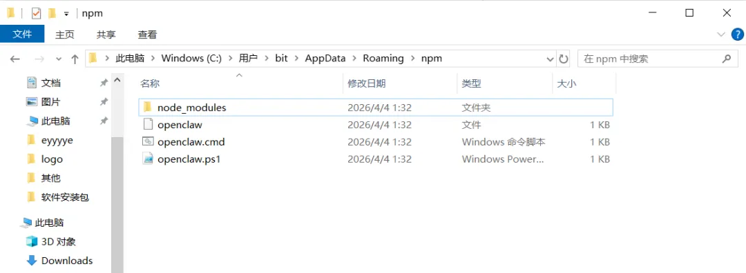 通过该方式安装的OpenClaw会安装到node.js的全局安装目录,一般在当前用户目录下的AppData\Roaming\npm下面:
