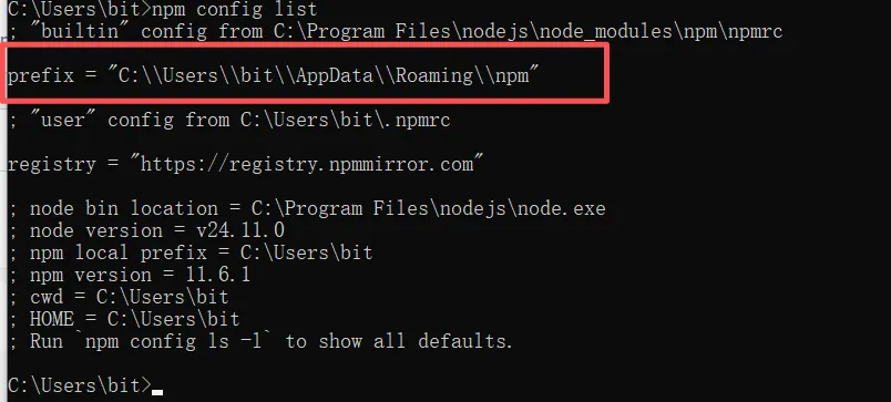 如果没有的话,可以通过在dos窗口中输入npm config list命令查看npm的prefix默认配置:
