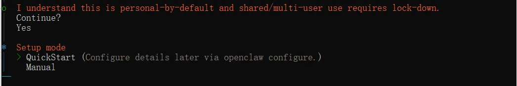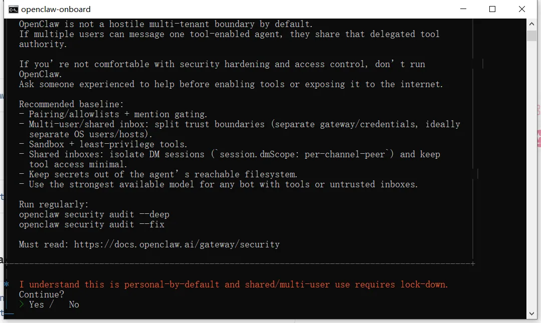 openclaw onboard --install-daemon运行后进入交互界面,首屏有安全警告,选择Yes后按回车继续: