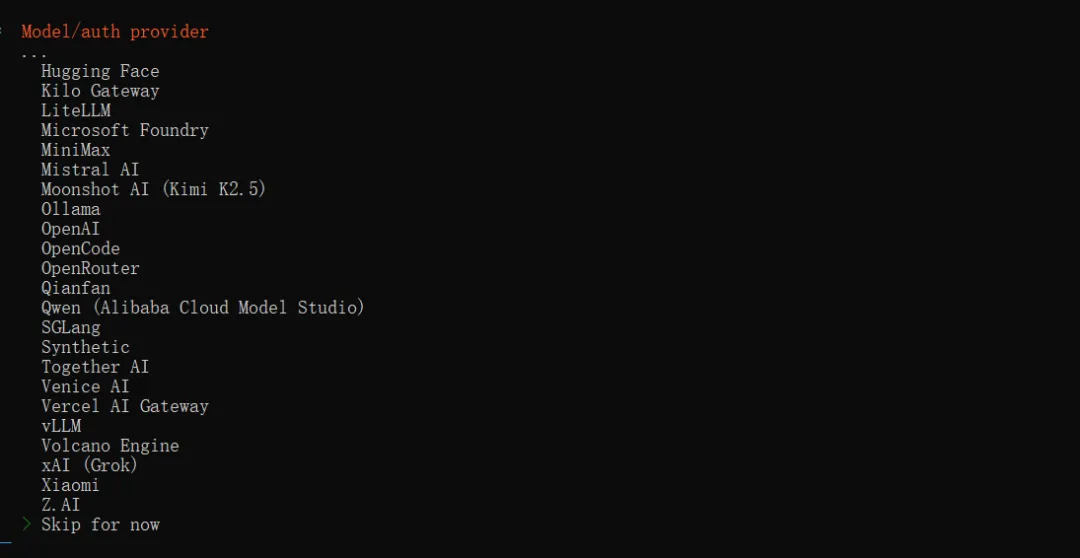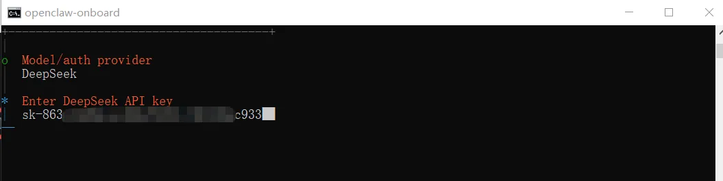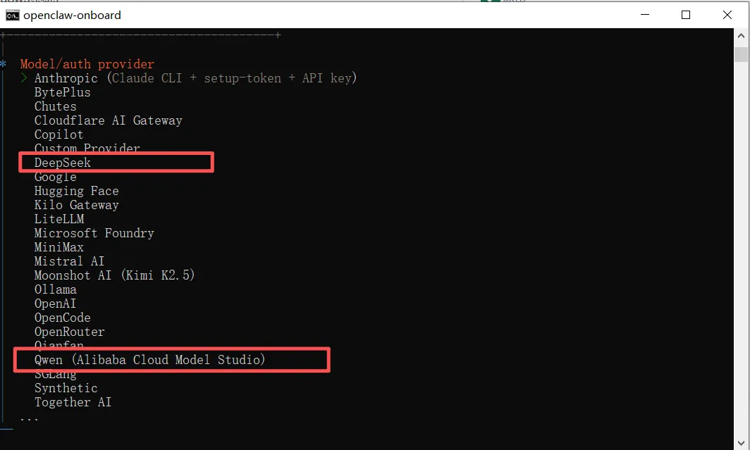 选择模型服务商,这里可以根据需要选择,我们这里选DeepSeek,如果要使用其他的模型可以后期让OpenClaw帮我们配置: