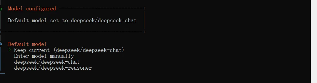 输入完API key后,OpenClaw会自动去联网验证,验证成功后提示选择默认模型,这里我们选择默认的deepseek-chat模型就行: