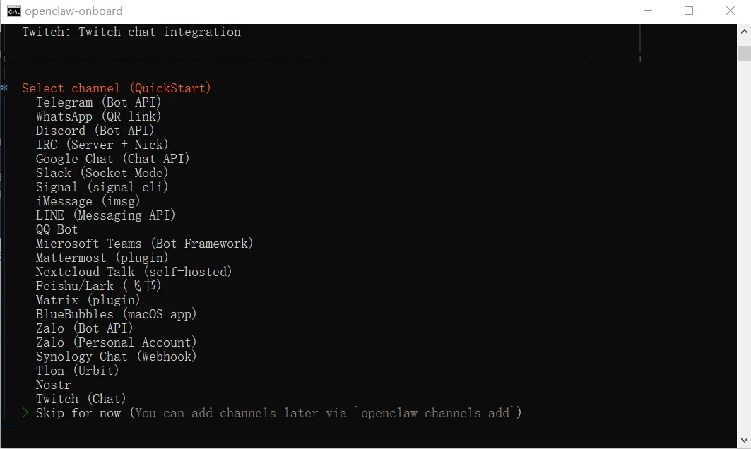 下一步选择可以联网的在线频道,这个可以后续在web页面中配置,所以这里我们直接选择Skip for now跳过: