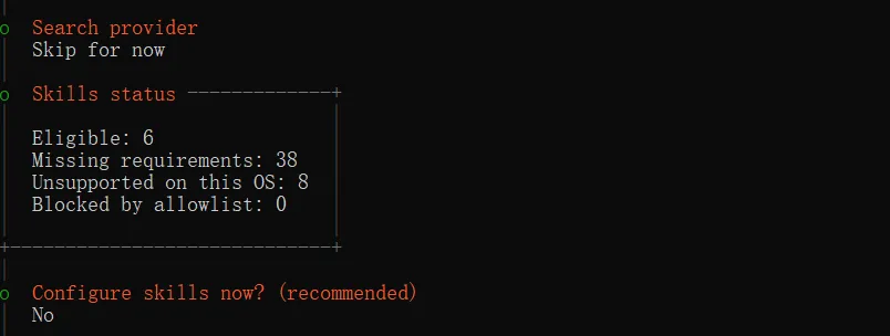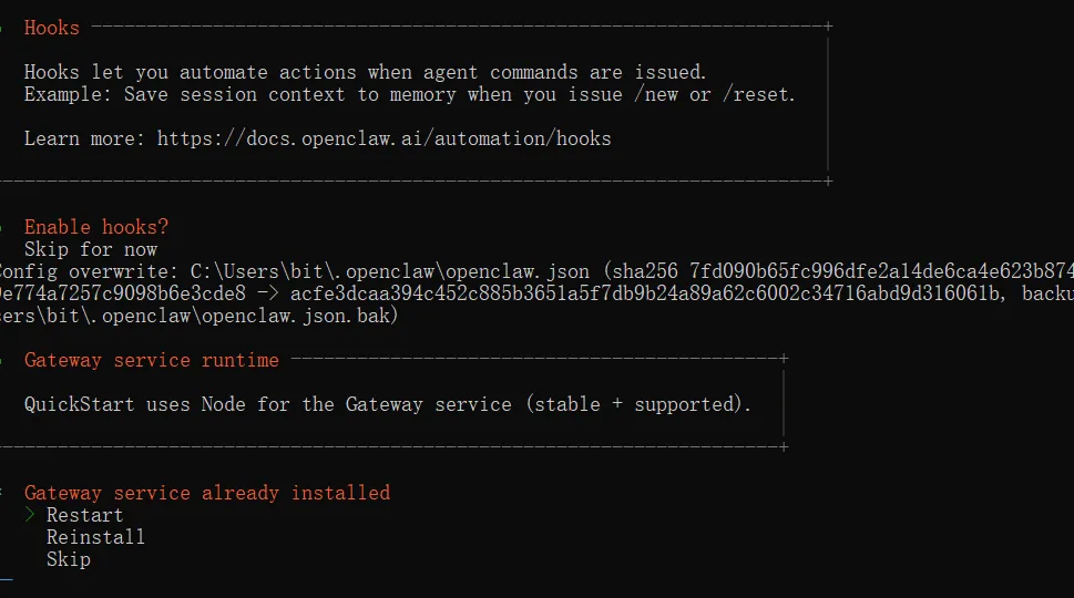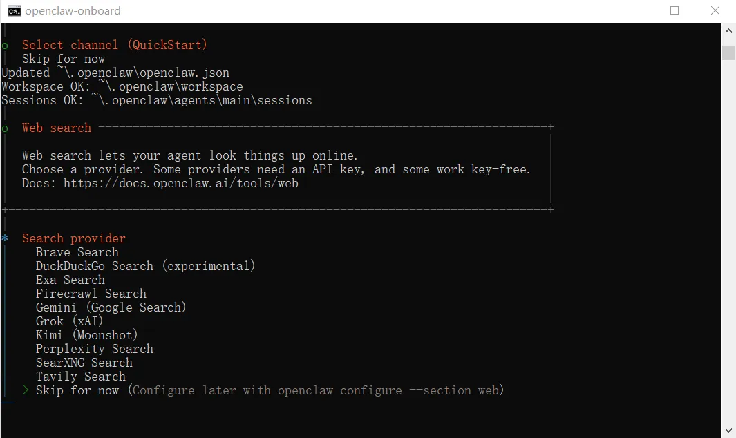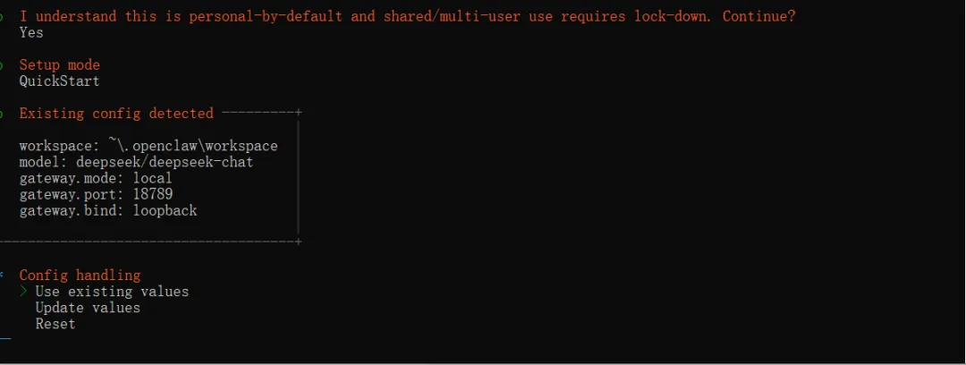 openclaw onboard因为其他参数已经配置了,这里到配置处理的这里直接选择使用现有的配置: