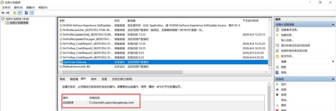 所有配置完成后,OpenClaw会在任务计划中创建一个OpenClaw Gateway的任务计划,每次开机后启动gateway网关: