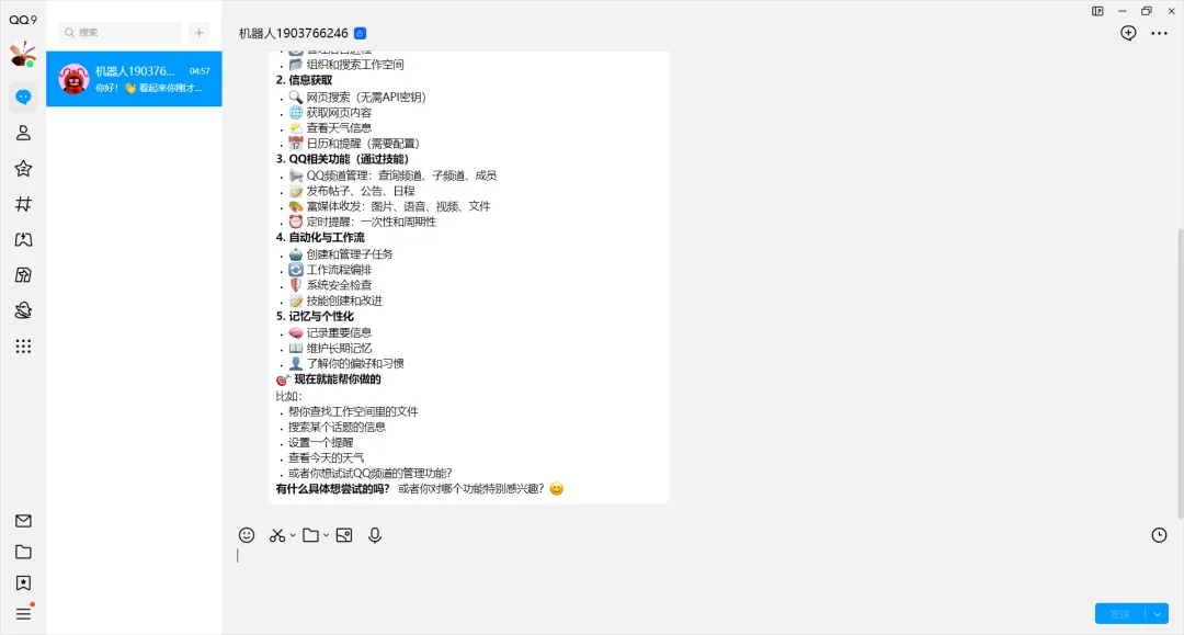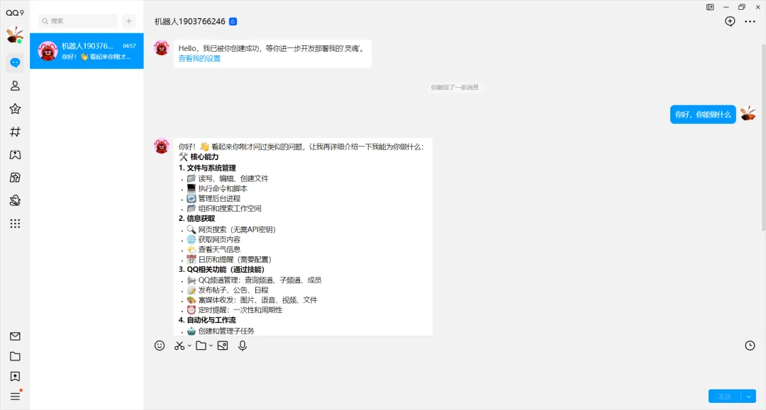 配置完成后就可以在QQ上与机器人聊天了,机器人创建完成后,会自动在QQ聊天列表中添加: