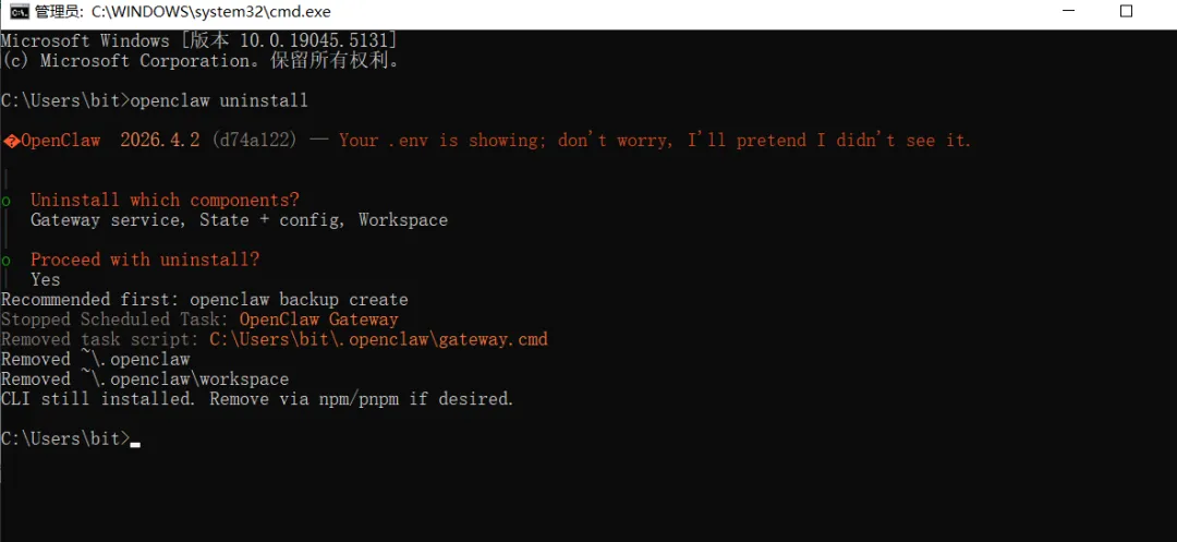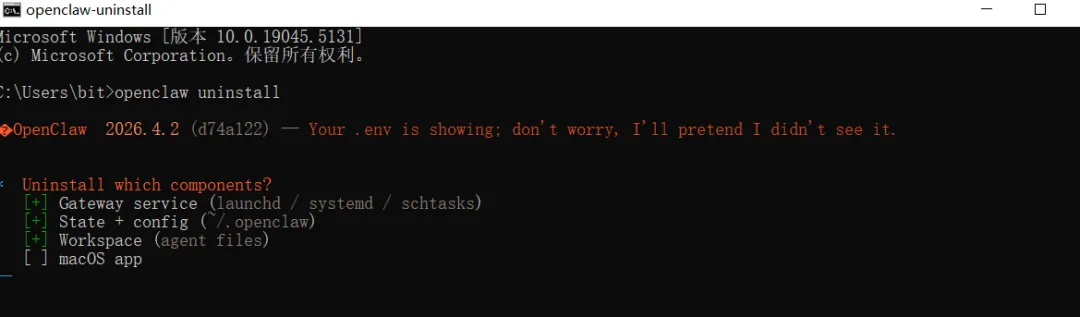 openclaw uninstall选择需要卸载的服务(空格键选择,选项前面格子变成绿色+号为选中):
