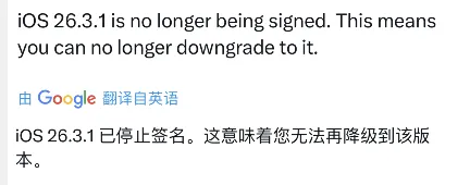 真快!iOS 26.3.1 系统验证已关闭,现在无法降级。
