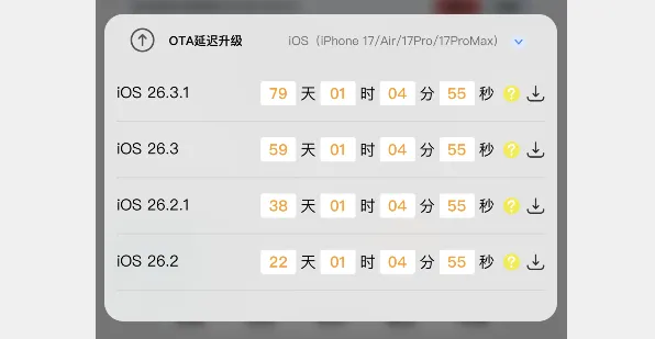 现在已经没办法降级到 iOS 26.3.1 系统,但低版本系统可以OTA延迟升级,高版本就没办法降级了。