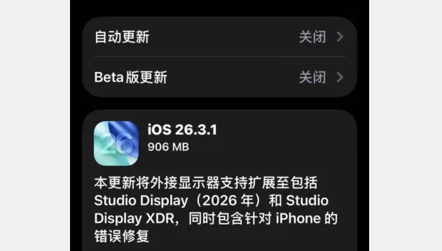 从 iOS 26.3.1 更新包描述内容得知,本次更新将外接显示屏支持扩展包括 Studio Display(2026年)和 Studio Display XDR,同时还修复一些错误。